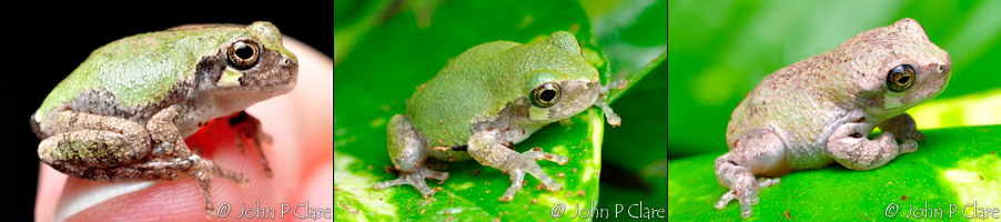 | Three adult Eastern Gray Treefrogs, Hyla versicolor. The one on the left, a female, was sitting on a different background to the two males prior to the photo - put them on the same background and they will all change to the same colour, and they can turn their pattern on and off too! (Photo: John P. Clare / frogforum.net) |