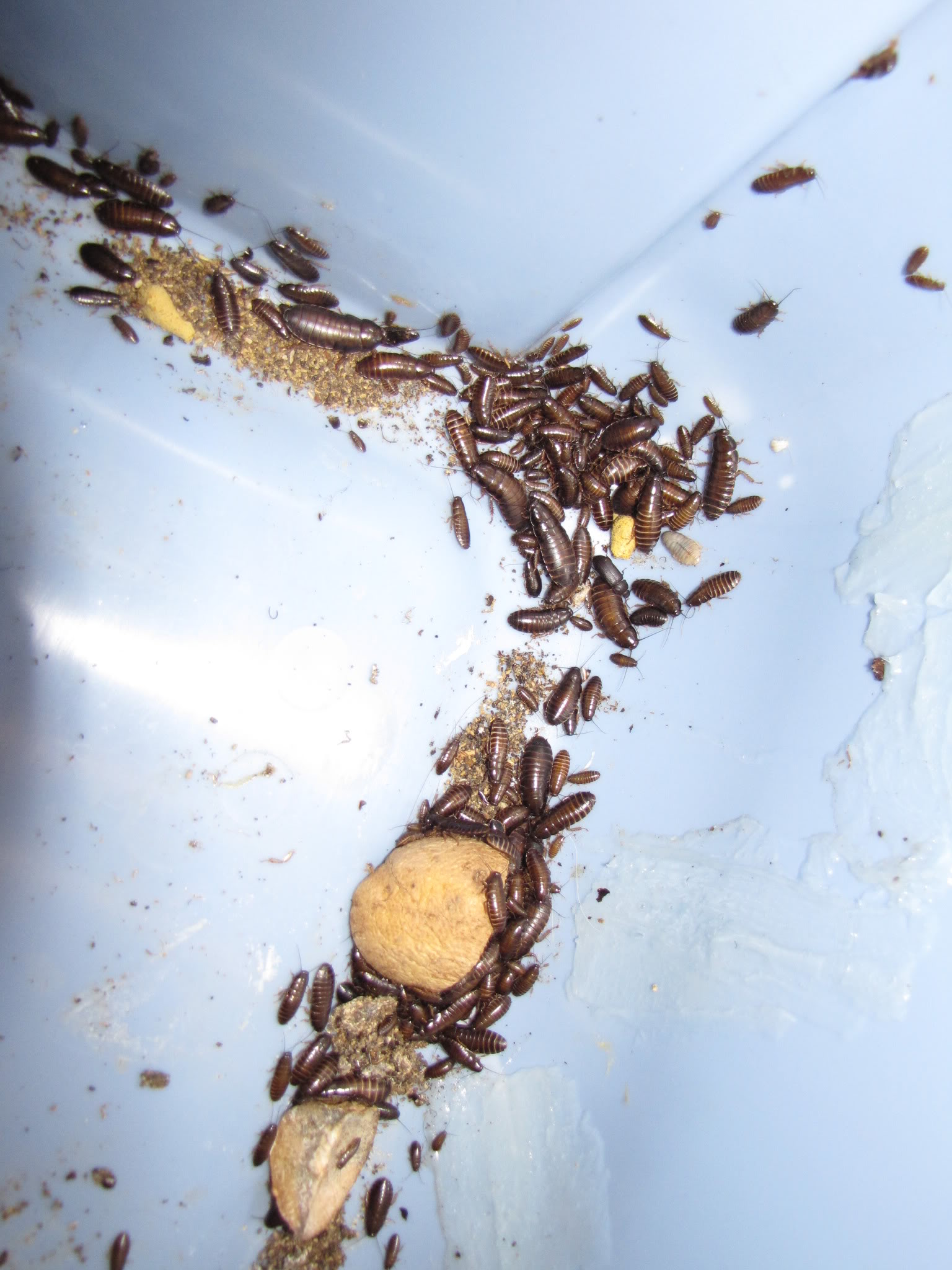 Here is also some pictures of my roach colony's. When I bought my first colony I was mislead by the owner of the roaches and told they where dubia with SOME lobster. I believe this was the owner not knowing any better, or trying to trick me. I seem to remember there being a FEW dubia, but they have all since been devoured from the looks of it.