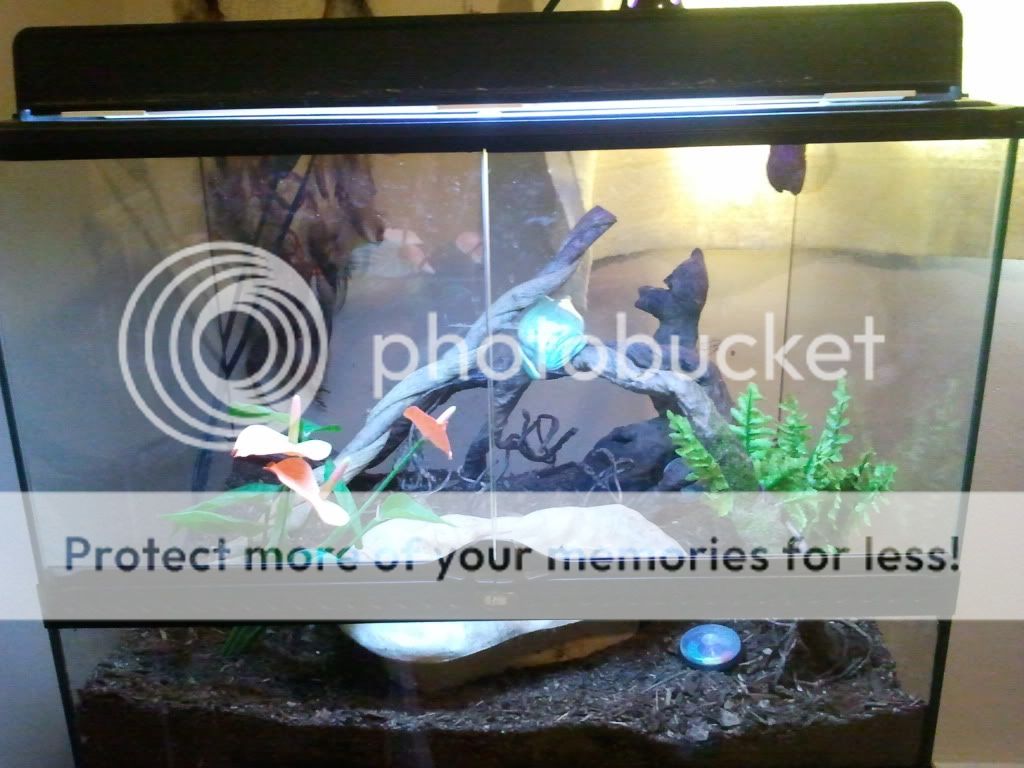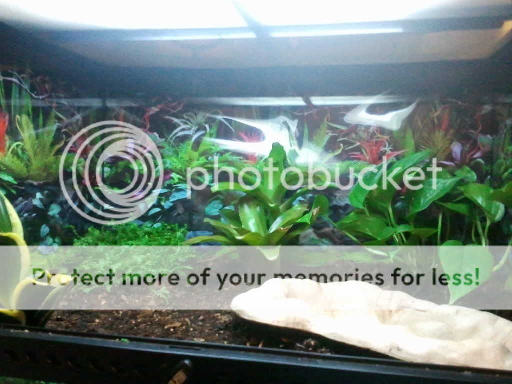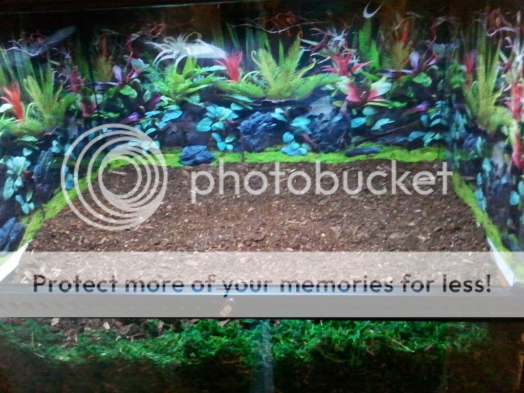 Very blurry front view of the tank. You can kind of make out the moss covering the dirt. All of the extra went to covering it. I shall try to get a better image up in a few days.