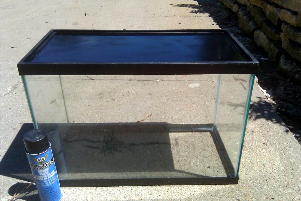 This is a 20 gallon(?) or 30 gallon(?) standard glass aquarium I picked up for a few bucks at a garage sale. It was used and filthy as most junk sale boxes are, so it was scrubbed out with a mix of hot water, sea salt, and chlorine bleach. It was then rinsed with a regimen of white vinegar and treated tap water. It was then hand dried, and left to sit under a UV sterilizer lamp for 4 hours. Once the cleaning and sterilizing was completed, I flipped the aquarium over and sprayed the exterior bottom with matte black industrial spray paint.