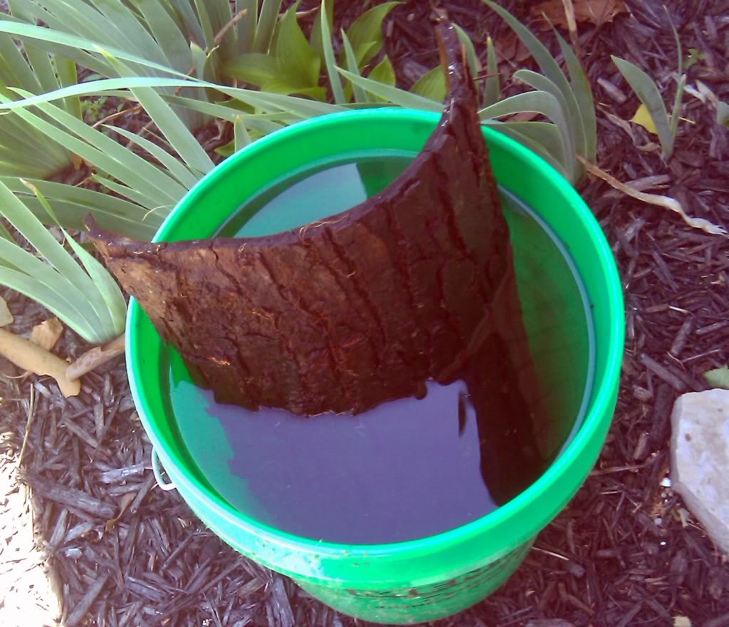Since I am keeping a fire going, I got a choice beverage and then began to remove the bark from the well aged firewood I have on hand.(I was forced to cut down a huge silver maple tree last year due to extreme longhorn wood boring beetle damage and an infestation of carpenter ants) Thanks to a year long curing process for the wood, the bark is already loose on the logs and comes off in large sheets. once the fire was ready to boil, I filled the pot with the hose and placed it directly on the large bed of coals. I then banked the coals around the pot to a height of about 5 inches. This allows efficient boiling. While waiting for the eight gallons of water to boil, I placed the choice sections of bark into a five gallon bucket of tap water after scrubbing it down with the hose and a stiff nylon brush.