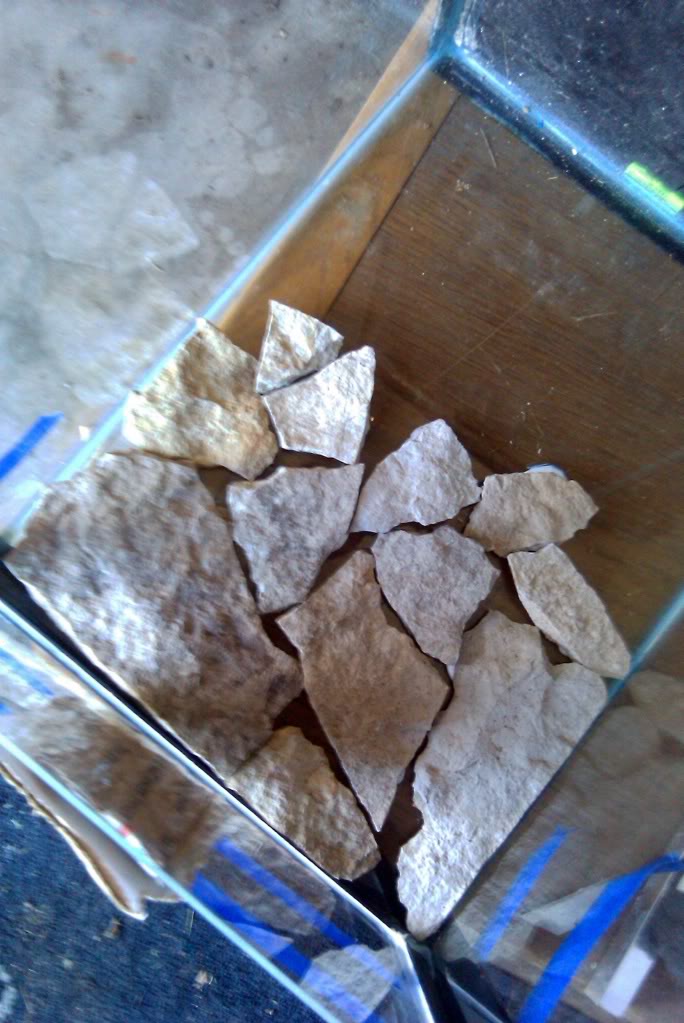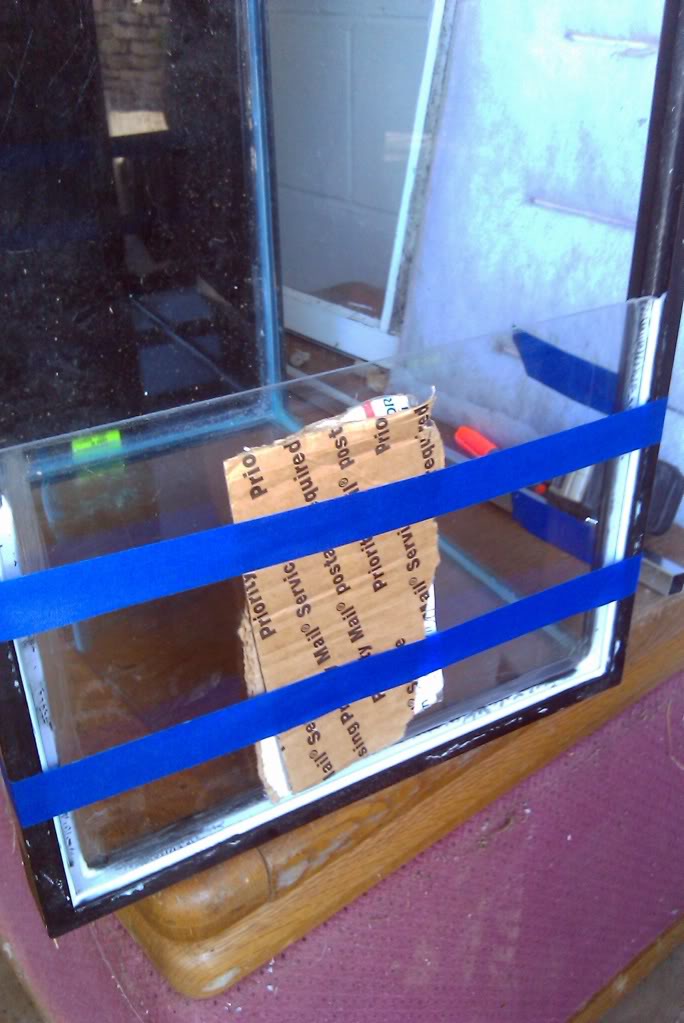 As I tend to build many vivaria, the rock I have in storage for the purpose is already cleaned, scrubbed and boiled. Before for anyone comments, yes it is limestone, however, my vivaria water (primarily rainwater) is all extremely hard in CaCO3 and is in fact aged with limestone due to the chemistry of my tap water. After choosing the pieces I wanted, I stood the now workably cured vivarium on end and proceeded to glue the rocks in place with standard clear silicone. At this time, I also trussed the new front panel in place with painter's tape and some scrap corrugated board for support. I then applied a bead of DAP aquarium rated silicone over the standard sealant to provide the structural strength needed to support the weight of what will be roughly 2.5 US gallons of water. (about 16lbs of weight)