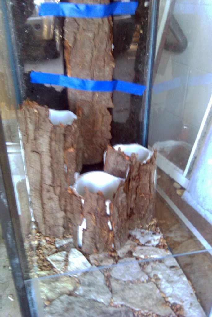 Step 6: While my now very hot bark is done, I set it on the stove top to cool and spent time silicone gluing three sections of 4 inch schedule 40 PVC drain pipe to the new bottom of the tank, aft of the rocks I glued in place earlier. The sections were siliconed with a thick bead around the bottom edge and pressed into place. The vertical edges were then siliconed in between each section and the sides of the tank to create three watertight, open ended cells, with the spaces in between completely sealed off from the water section of the tank floor. A small damp sponge was used to work the thick beads into smooth unobtrusive seams. I used White GE2 silicone for this as the structure of the PVC is strong and heavy, thus keeping out the water well on its own. I then left the tank to cure to a workable condition. I also filled in the gaps in the floor with a 50/50 mix of aquarium gravel and aquarium rated epoxy.
