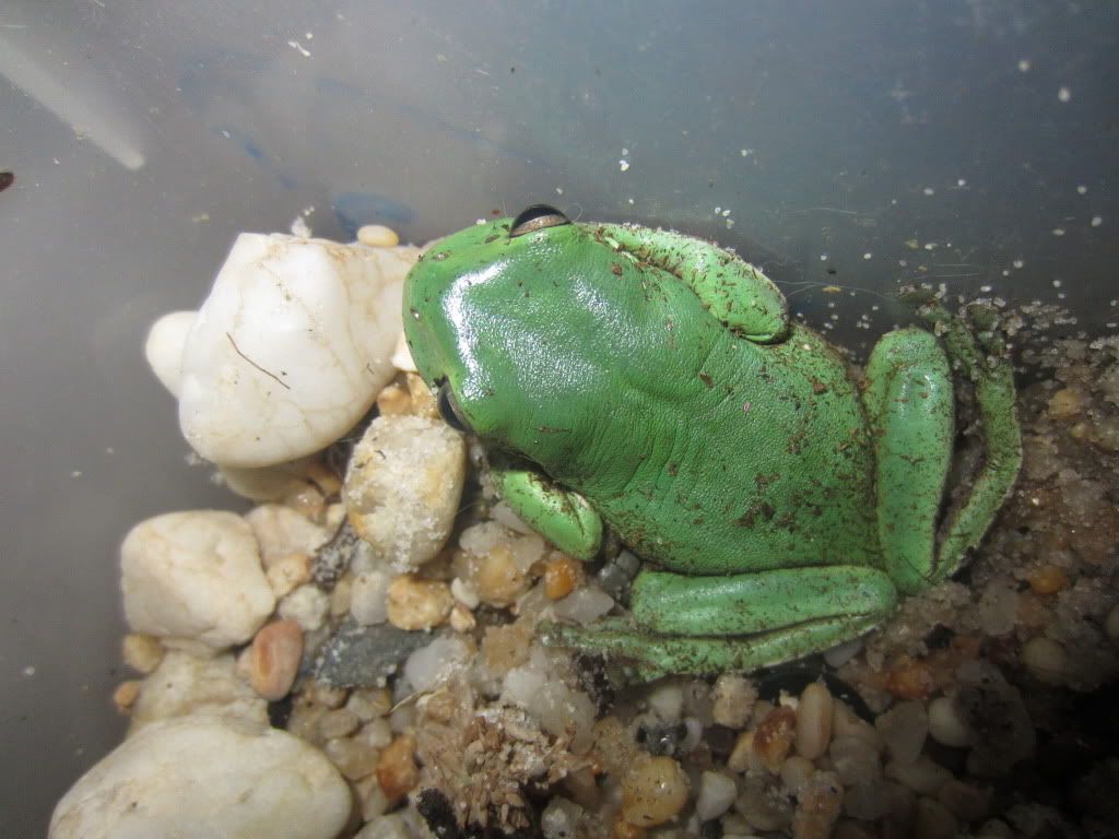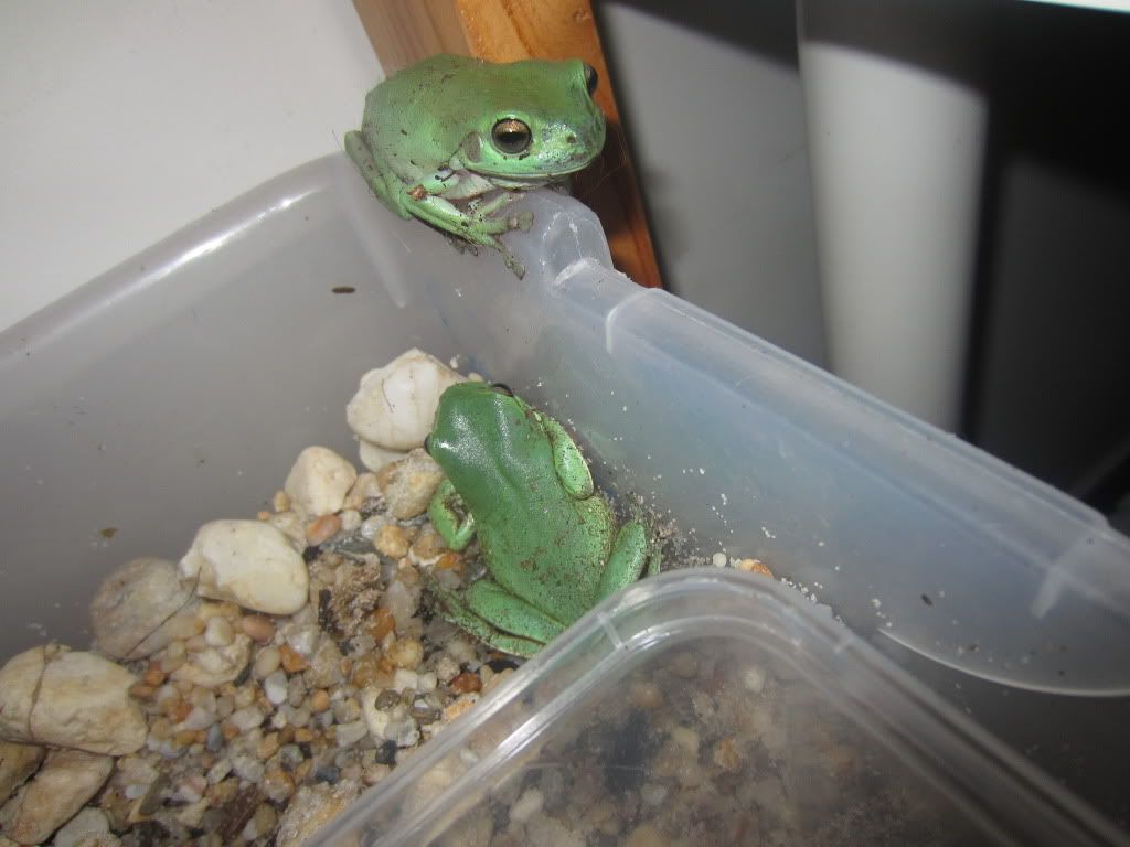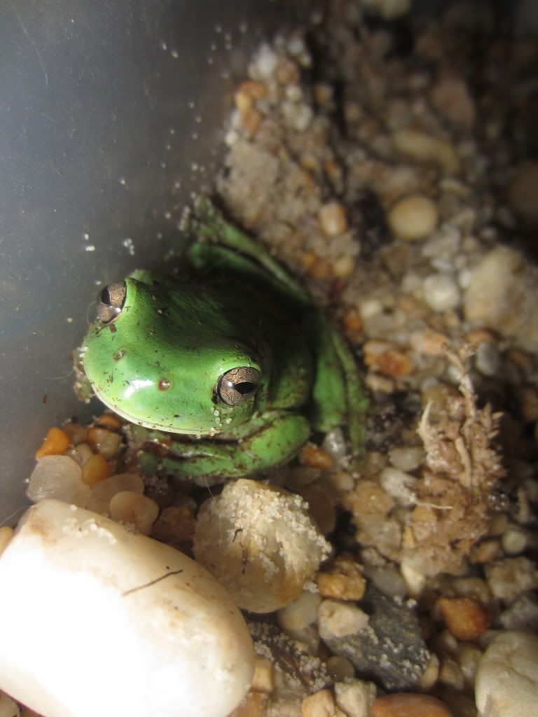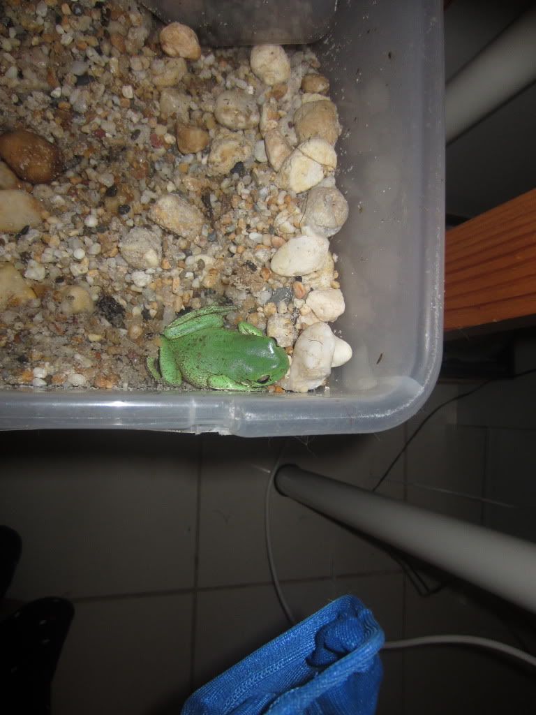 I was asleep on the couch when I woke up to that awfull scream frogs make when they feel threatened. I didn't realise it was one of the frogs at first because I was half asleep. I rushed into the room where I heard the scream and saw my cat (Hamish) and I couldn't really see anything else because I forgot to turn the light on, and its 3am, but I kind of gathered it was a frog noise that I heard by then, and I thought it was my brown tree frog flower. I picked up Hamish and threw him into another room and shut the door.I ran back to turn the light on and saw my baby boy Kevin sitting there all puffed up(My whites tree frog) He hopped behind a cabinet and I started crying because I didnt really get to see if he was hurt or not. He walked out from behind it and I saw he was okay. I kept a close eye on him, and I was reluctant to pick him up incase he started screaming again so I just watched him for a while. He hopped over to a bucket full of stones and pebbles and I grabbed my camera (I have no clue why, I am just one of them people who like to take pictures of everything) he sat on the ledge of it for a while. Then he started climbing inside the bucket when I saw my other whites Eddie sitting there peacefully. Kevin then jumped over to ontop of his tank where I keep all my fake frogs (The plastic ones and stuff) and then I was able to get him into a container and I put him into his tank. I eventually got Eddie in the tank too.