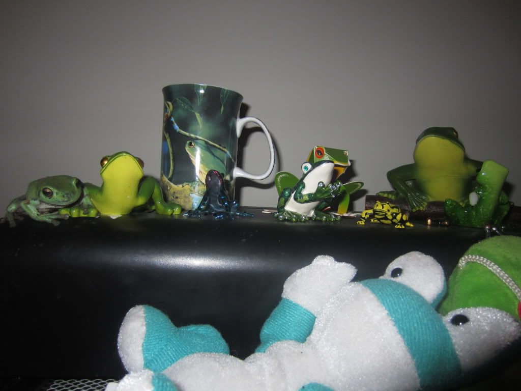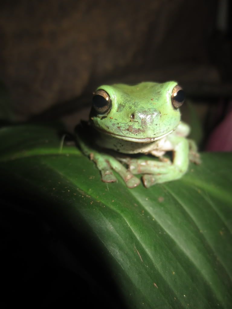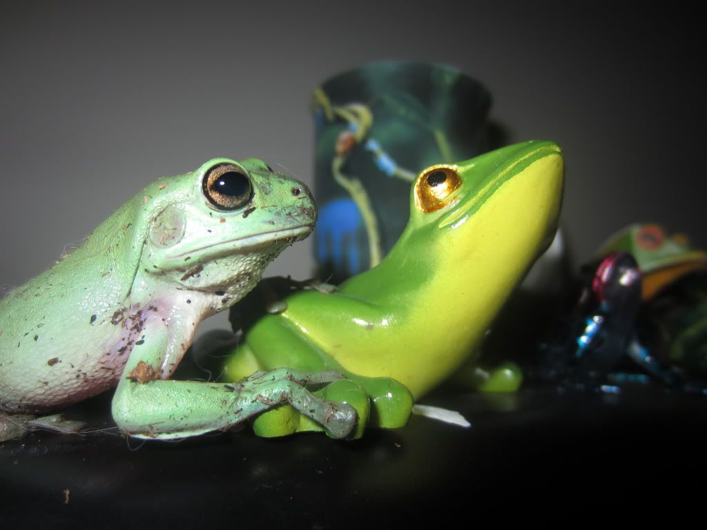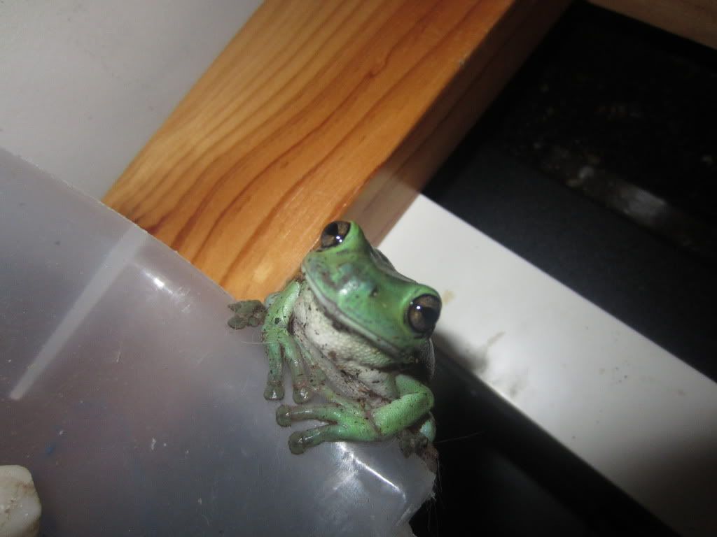 I was asleep on the couch when I woke up to that awfull scream frogs make when they feel threatened. I didn't realise it was one of the frogs at first because I was half asleep. I rushed into the room where I heard the scream and saw my cat (Hamish) and I couldn't really see anything else because I forgot to turn the light on, and its 3am, but I kind of gathered it was a frog noise that I heard by then, and I thought it was my brown tree frog flower. I picked up Hamish and threw him into another room and shut the door.I ran back to turn the light on and saw my baby boy Kevin sitting there all puffed up(My whites tree frog) He hopped behind a cabinet and I started crying because I didnt really get to see if he was hurt or not. He walked out from behind it and I saw he was okay. I kept a close eye on him, and I was reluctant to pick him up incase he started screaming again so I just watched him for a while. He hopped over to a bucket full of stones and pebbles and I grabbed my camera (I have no clue why, I am just one of them people who like to take pictures of everything) he sat on the ledge of it for a while. Then he started climbing inside the bucket when I saw my other whites Eddie sitting there peacefully. Kevin then jumped over to ontop of his tank where I keep all my fake frogs (The plastic ones and stuff) and then I was able to get him into a container and I put him into his tank. I eventually got Eddie in the tank too.