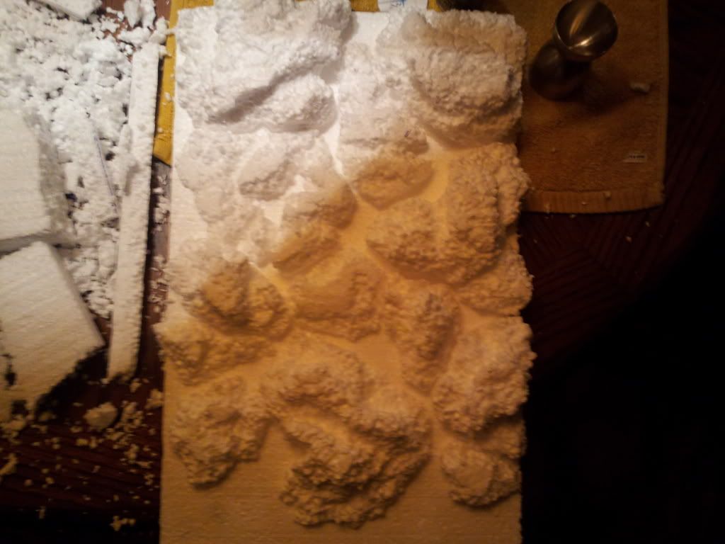 For this background i used the same kind of styrofoam but this time i bought a big 4'x8' sheet of it at home depot. This stuff had a plastic liner on one side and a foil liner on the other, i'd suggest not getting this stuff as the plastic is a pain in the butt to peel off. I'll never use that kind again.