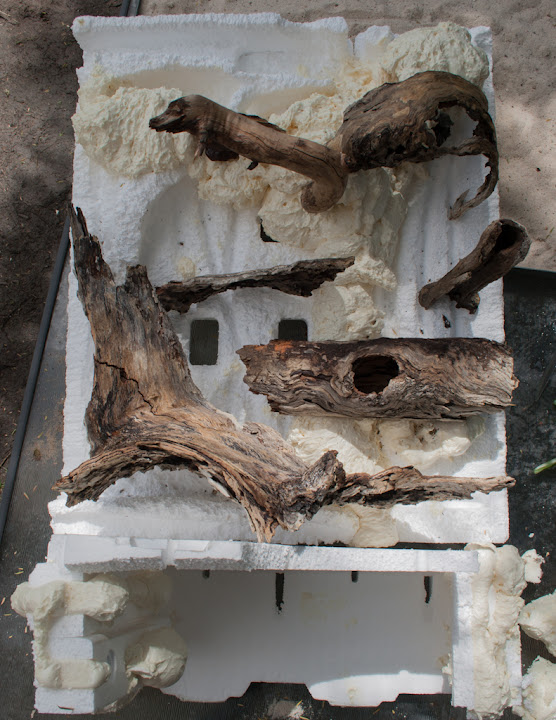 Laying expanding foam on the background together with some pieces of wood... The bottom (ground area), is a work in process at this stage... It has been cut but still needs foam to cover the front...