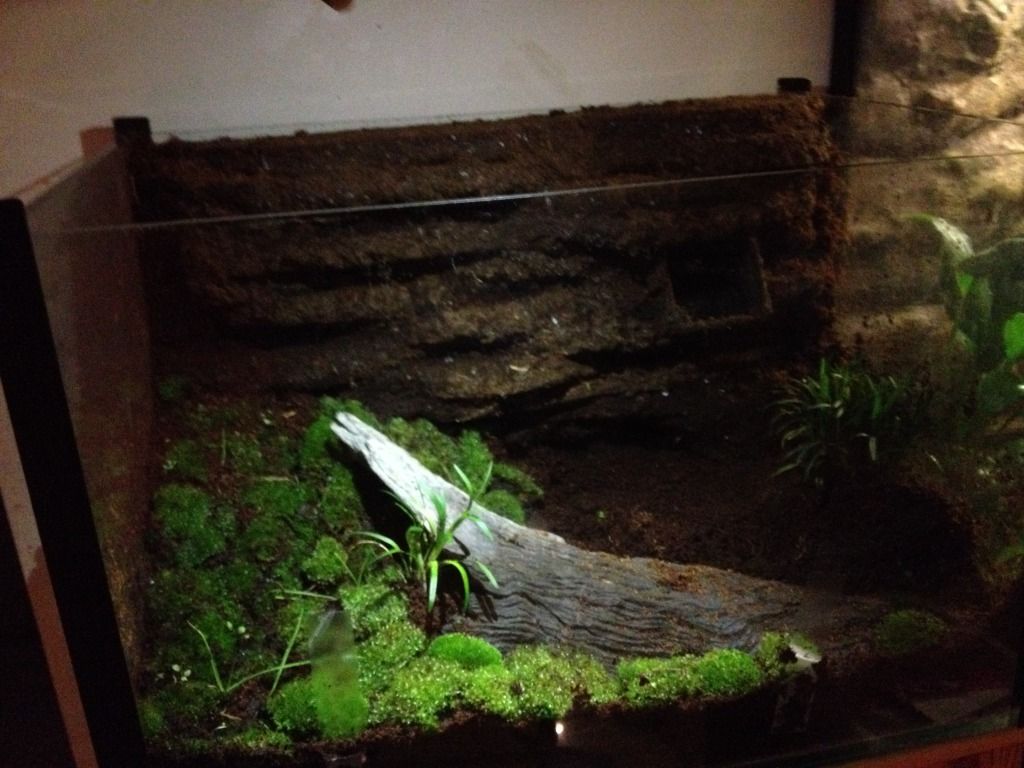 Iv'e put moss all over the ground so hopefully it will grow over the background and the wood. I also put some mondo grass in thereI've left some space moss free for the water dish and some other plants. I want the moss to really take over though so i think I'll leave it for a couple of months or so before i put an animal in there
