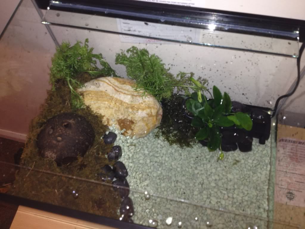 above is the setup i have so far. gravel on the bottom, sloping up to a small bit of land. The land is covered with eco earth and then topped with moss. i have a few small plants in there and a filter in the water.