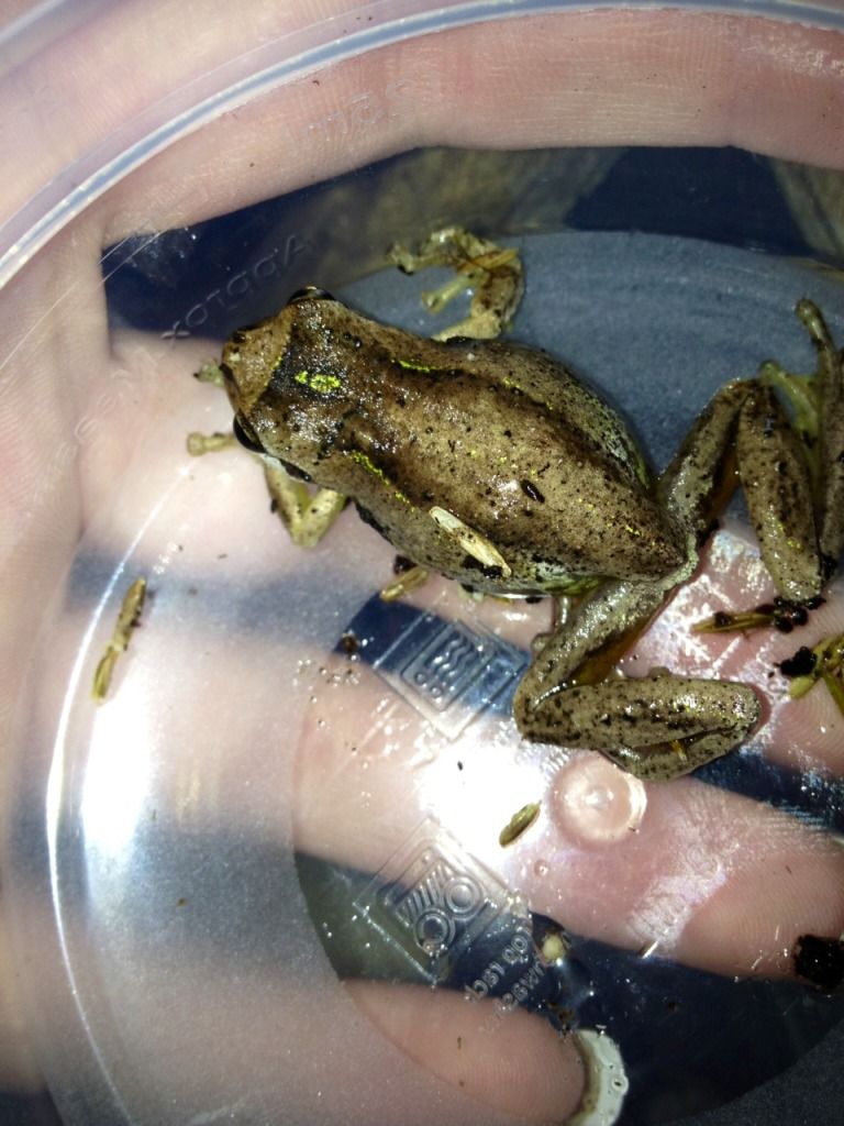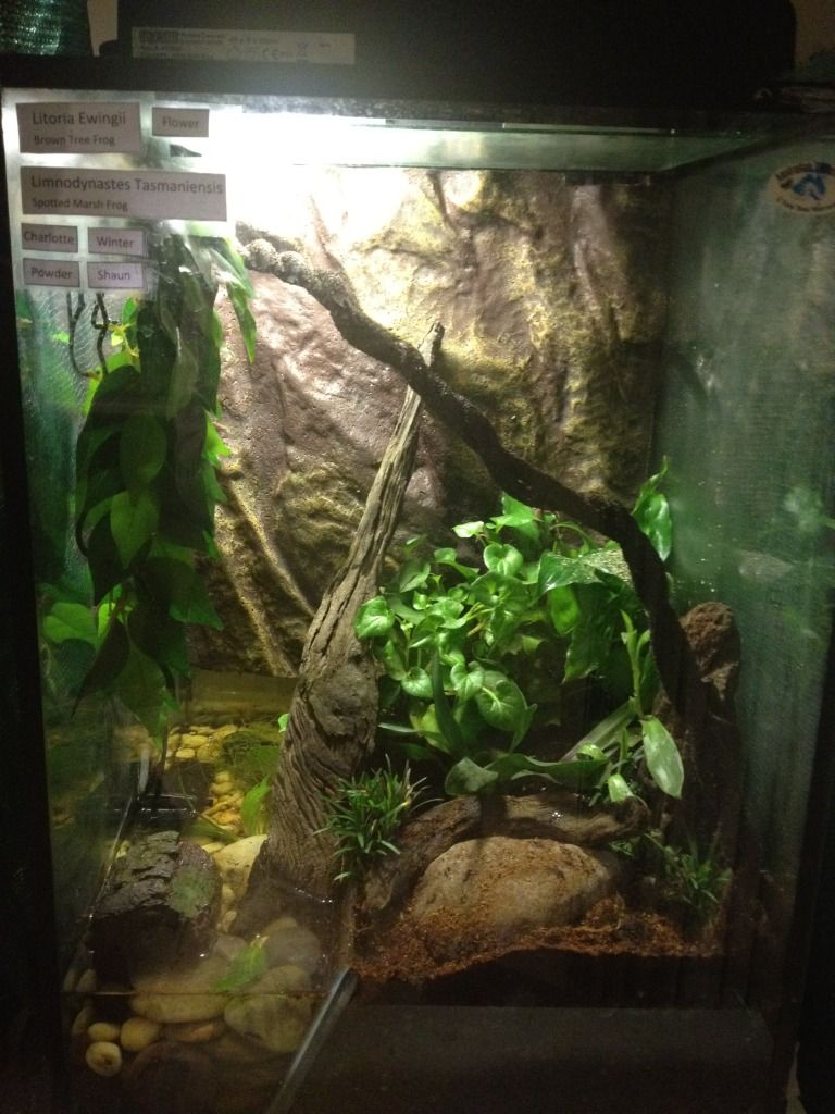 2-# on inhabitants - specifically ( if there is another frog ---size differences ? 7. There is Flower and six other spotted marsh frogs. They can live communally and they are all the same size and have been living together there whole lives. (Just a note, the frogs are only a few centimetres long and the rule of thumb is ten gallons on the first frog and add five gallons for each frog added, so they aren't over crowded)