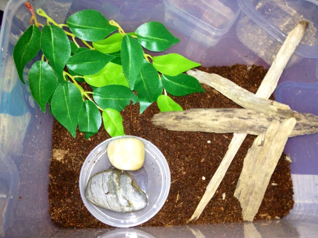 7-enclosure set up i.e. plants( live or artificial) wood, bark etc -how were things prepared prior to being put into the viv Live plants (mondo grass, peace lily, baby tears, hairgrass, bromiliads and others I forgot the name of) Real wood and a massive rock that they sit on and an exo terra jungle vine and hiding cave. the plants got new soil and roots washed ect, and the wood was boiled and baked.