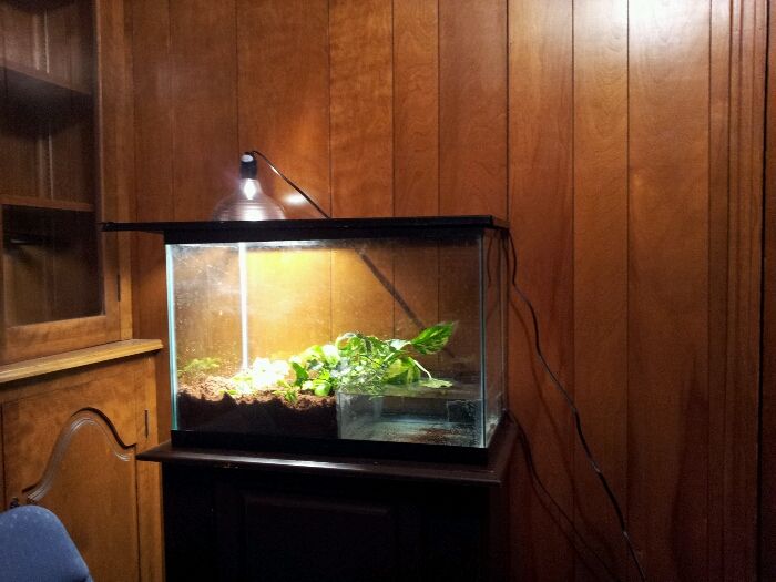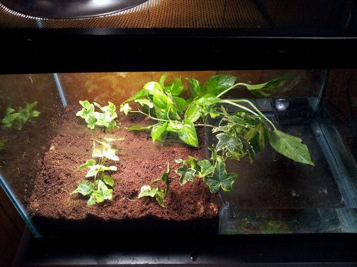 Thanks! Ok here is the tank so far. I needs a bit more substrate and plants. I bow divided almost half the tank and made the water level 4 inches high ~4.5 gallons of water. Since I had to transfer my scorpions to a 20gal long I reused their substrate in here. I skimmed off the top 2" of coco from their tank and used what was below. Wondering what plants I want to put in here that are safe, are there any aquatic plants I can add? I'd love a lilly pad
