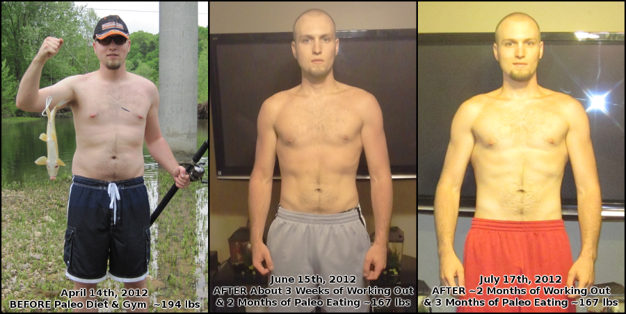 I decided then I needed to do something about my diet that I could make more permanent. Counting calories simply wasn't an option. It involves obsessing over numbers, eating tiny portion sizes, you have to weigh your meat, measure out everything. No thanks, not again. It was in April that I discovered the "Paleo Diet" or the "caveman diet." Basically you eat only foods that were available to us in the Paleolithic (caveman) era, foods that our bodies evolved on. So no grains (bread, pasta, corn, rice), no legumes (soy, beans, peanuts, peas), no dairy (except real butter), no processed foods, no preservatives, no sugar. Basically all I can eat is Meat, Vegetables, Fruit, Nuts, and Seeds. If you're interested in this way of eating check out Paleo Diet Lifestyle | paleo diet tips and recipes Let me tell you, this diet is AMAZING! I have lost all the weight I gained back and then some on this diet, plus I feel great. Currently, and for the past 1.5 months, I have weighed less than I ever have, 167lbs and holding steadyThat means from the summer of 2009, when I weighed 245, to now I have lost a total of 78 lbs! Some recent before and after pictures on Wednesday!