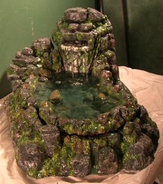 thanksa local fish shop sells reptiflo 250 pumps for $7. i grabbed a few, and $1 for the tubing. i just zip tied the tubing tk my eggcrate wall and the gradually built up the great stuff around the tubing. some brown silicone and cocoa fiber and then i just let nature take it's course and let the water erods the fiber to reveal a nifty little water feature. like i said, easy