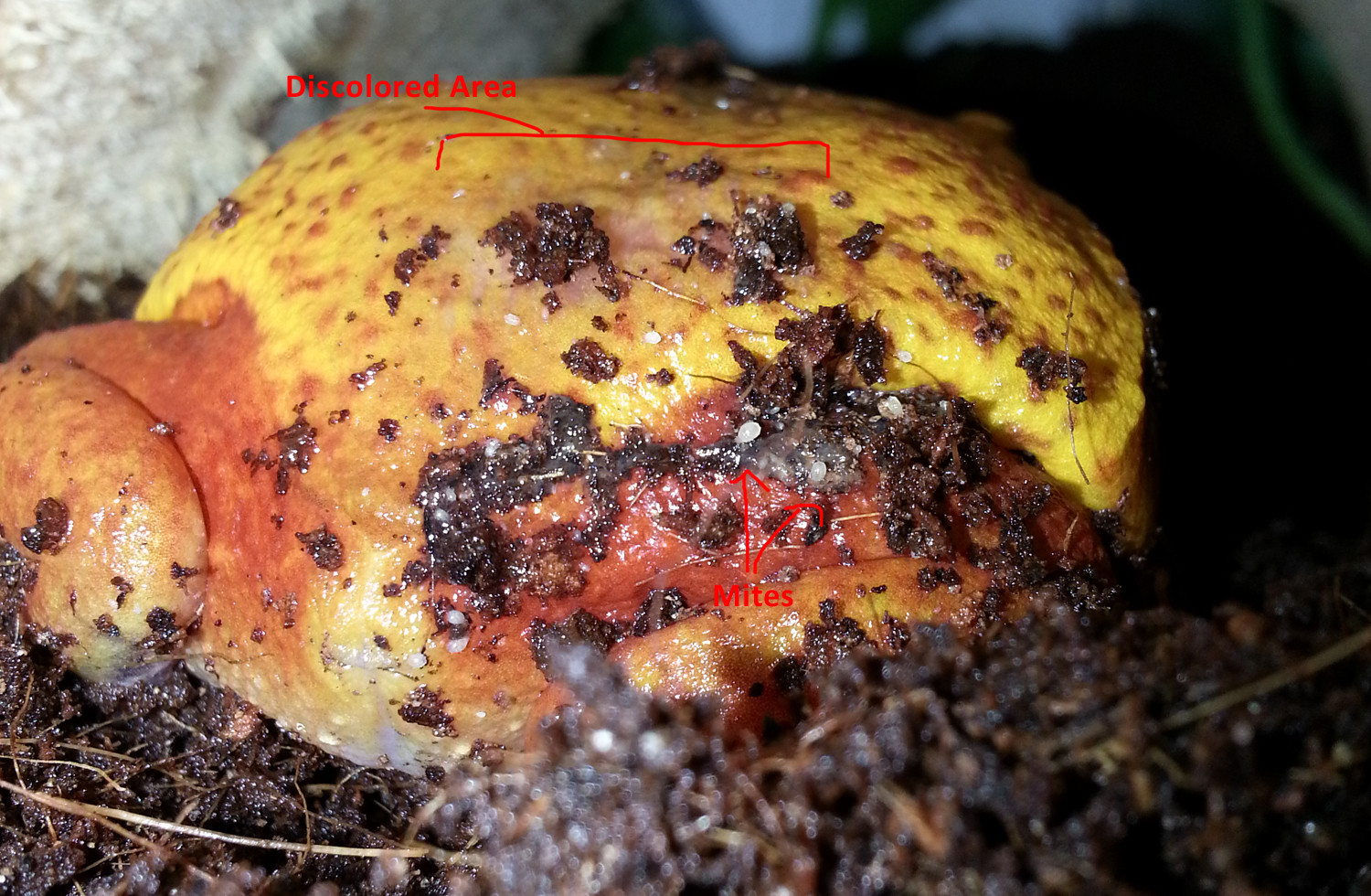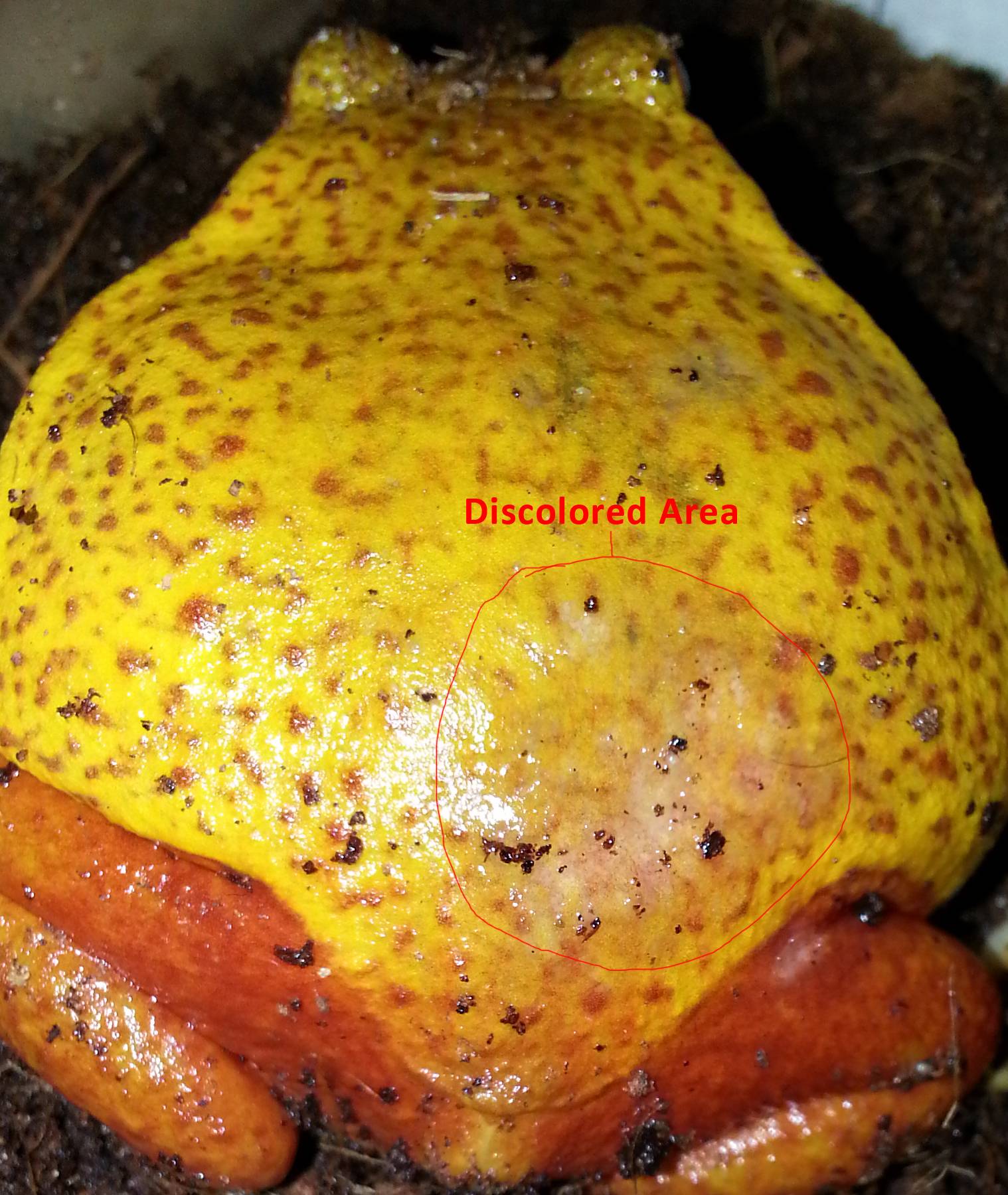 Now, for the second part. After I washed the substrate and mites off of Makoto, I found a discolored spot on his lower back. It's a slightly pink area and the skin looks slightly transparent maybe. I might describe it as a sore, but not sure. There's no blisters, or cuts, or bleeding or anything like that. However, I gently touched the spot and he seemed to panic and jumped away quickly, like that spot hurt or was sensitive to touch. Otherwise, he seems fine. His behavior is fine and typical of him. He tries to hop and get away from being touched or picked up. Croaks occasionally at night. He has plenty of energy it seems. He's eating. His eyes are clear, and no other odd spots I've noticed. He did shed his skin about two weeks ago, but I don't think that would be a cause or symptom of this, but I'm not sure.