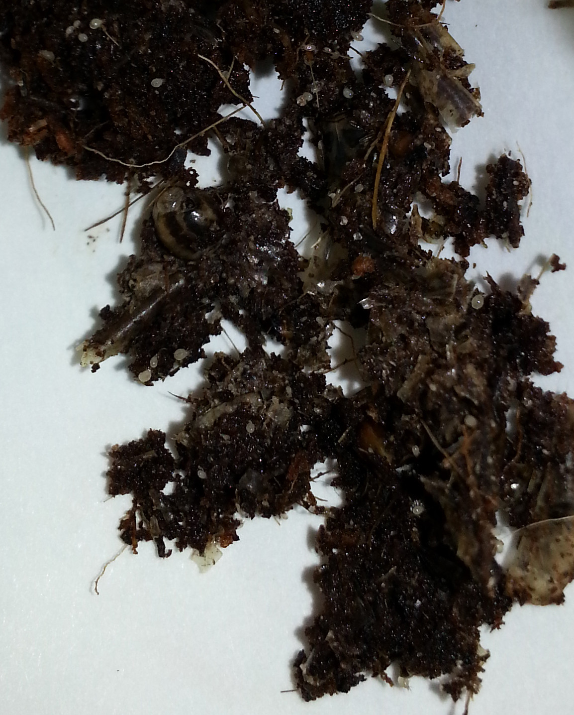 First, his hind quarters were all covered in wet substrate, and within that I saw all these tiny white bugs crawling on him. From reading, I figured these were mites, and after looking it up online, I'm pretty sure they are little detritus mites. So, I took a photo of his behind (later in the post), and set him in his soaking dish and poured some fresh bottled water on his back until the dirt and mites were washed away--he seemed to enjoy this too. I then pulled up his half-log and looked at the two spots where he likes to stay, and sure enough, these areas were quite moist and dirty (from his fecal matter I assume) and had a bunch of mites in it. I took out the substrate from these areas and mixed fresh coconut fiber in. I also found a piece of waste that he made last night, and sure enough, it was covered in the mites too. I broke open his waste to make sure there wasn't anything else in there, but only mites (took a photo too).