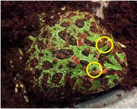 Here's a Ornate horned frog, with the false eyes encircled in yellow.