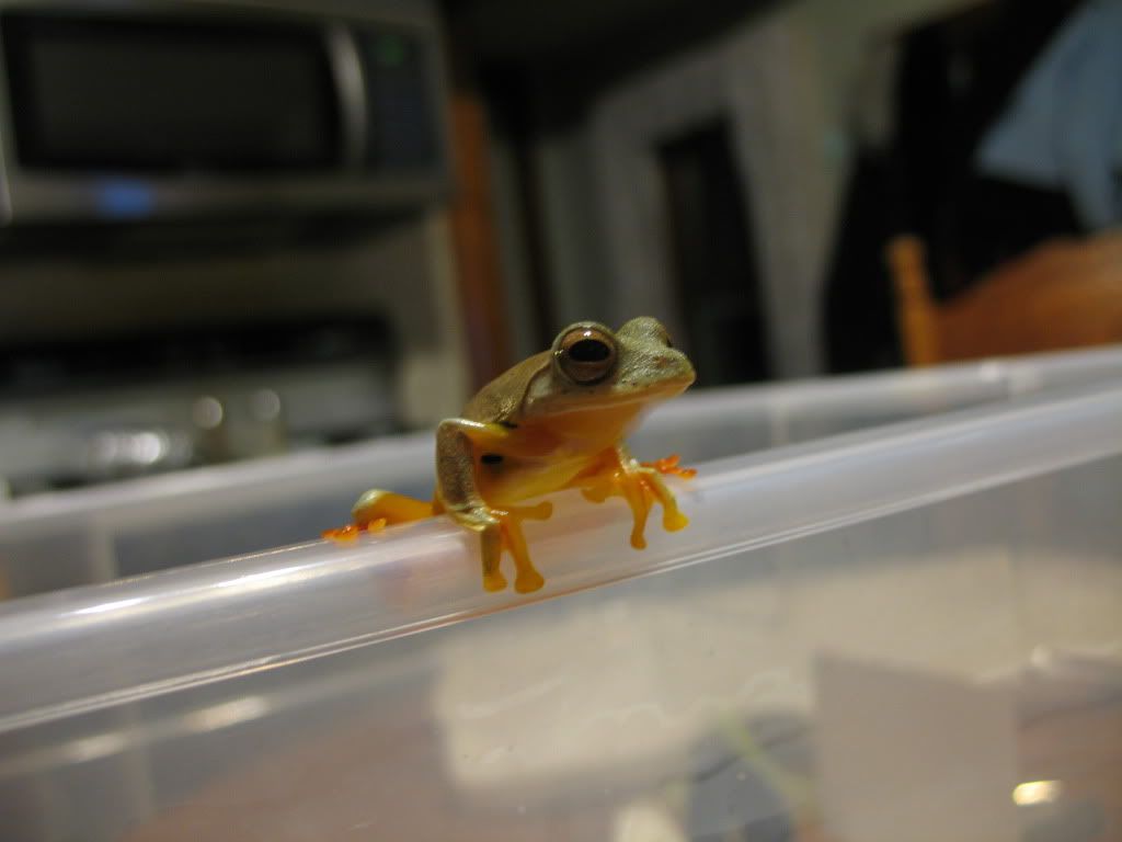 It was pruning day today for Bamf, my Hyla cinerea. She's pretty skittish, so out of the tank she goes while the sharp pruners do their work. On the way to a food filled holding bin, she got in the way of the camera:
