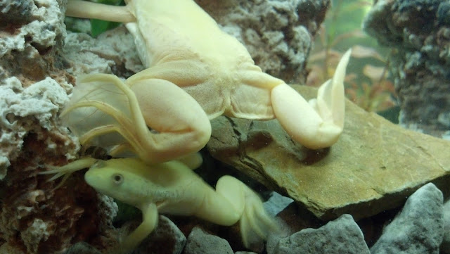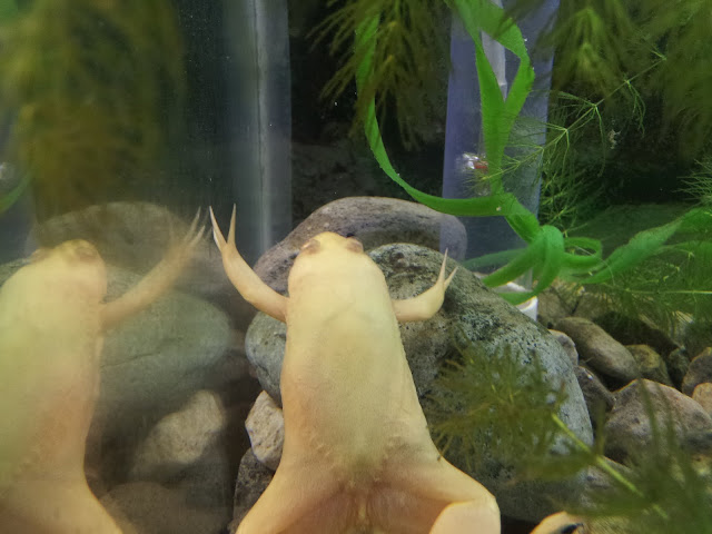 Life got really crazy and I haven't been on in awhile...so much to catch up on!! Thought I would update how we are getting along. Tad (who I'm beginning to suspect may be a Tad-ette ??) got a much bigger tank and is loving life with all the room to do the breast-stroke! I work from home and spend on average 10 hours a day at the computer, so I set up the tank on the long side of my desk. Tad(ette) loves hanging out and watching my computer screens. Lately I've noticed the interesting skin markings he(she) has...almost like her skin has been stitched together. It's really cool! Now I'm contemplating a name change to Frankie...works for either sex..lol.