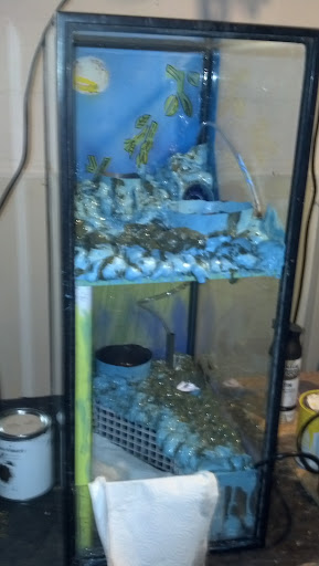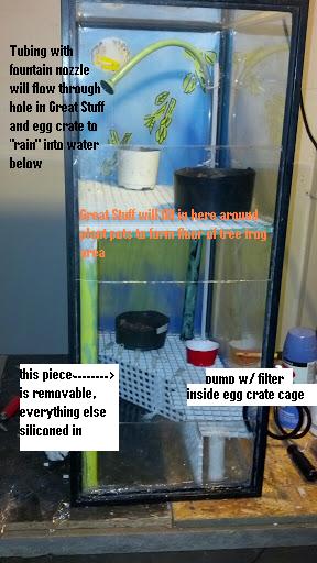 Utilizing a 40 G tank I have, dimensions: 12" x 18" X 30" to make a two level frog vivarium. The two levels will be completely separate but will share a water system. The top will be suited for a tree frog (undecided which one yet!) and the bottom will be either my new Chubby frog or a Pacman (I've really wanted one for a while now)