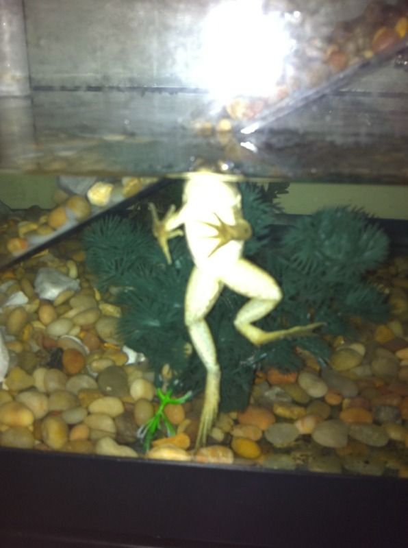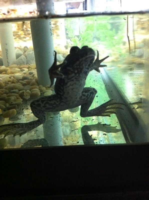 However, I am now in the process of redoing the whole tank. I found that they prefer the water side with stones for climbing and hiding. Also, they really made a mess with the land side--always getting the soil etc into the water. I'm redoing it and it will be all water, with a stone climbing wall and other 'islands' of stones and a fake log for a hide. They also like plants for hiding (and destroying) I started using plants without soil a while ago & found that there are several types that do well in the water alone. I root them in water, then put them directly in the tank, using some stones to hold them up in place and to protect the roots and to keep the frogs from getting tangled in the roots.