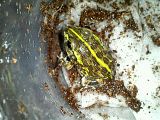 Hi Everyone! This is my new Pyxie Frog Chomper. I was hoping someone could tell me if he is indeed a African Bullfrog or the Dwarf? I did do as much research I could just in case to help tell the differences between the two but I still feel I dont know enough. Most of what I found out was to look for the three green lines on the body and and a white dot where the eardrum is supposed to be located.