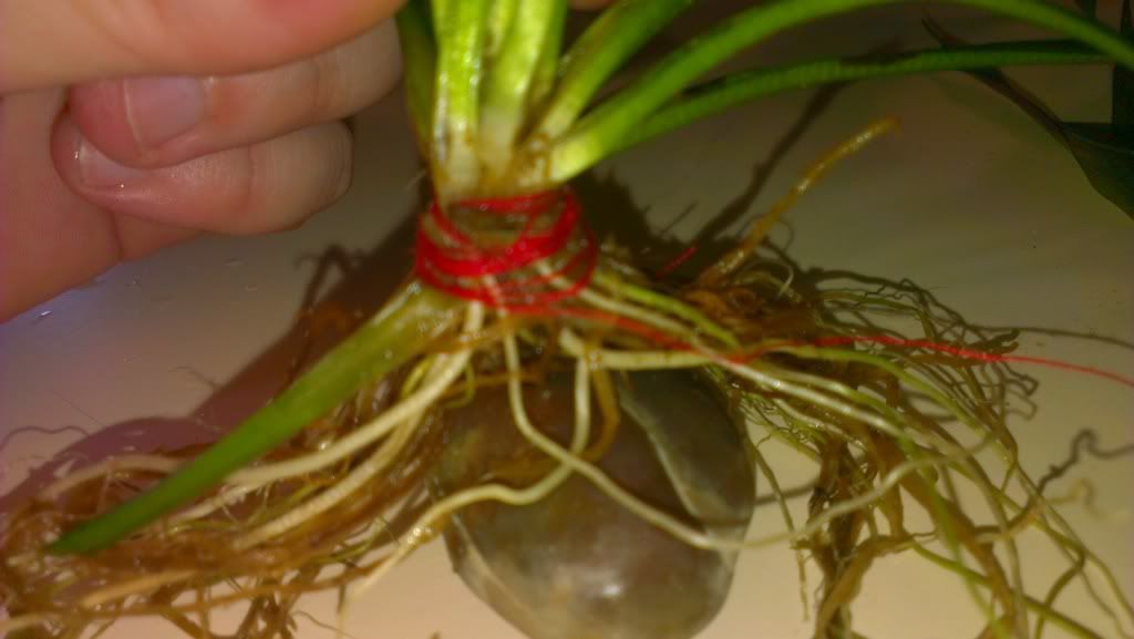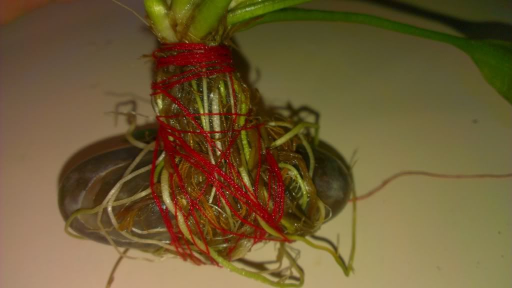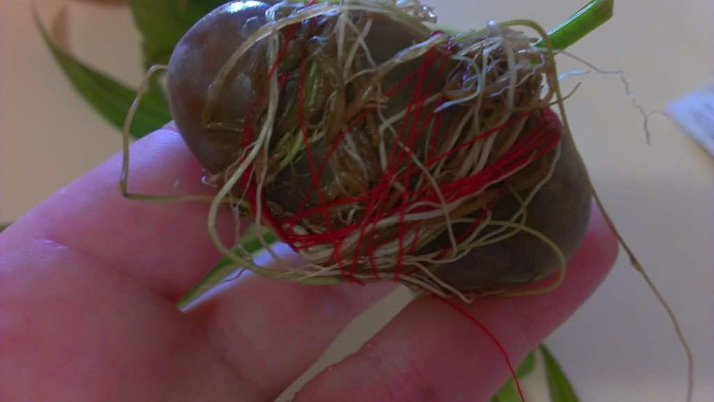 Step 5. Secure with thread. Crisscross thread to bind roots to rock.