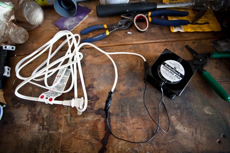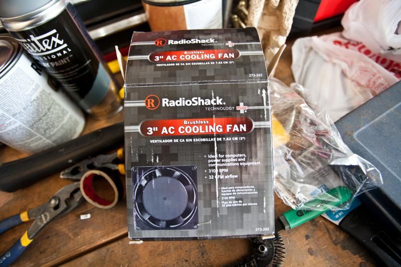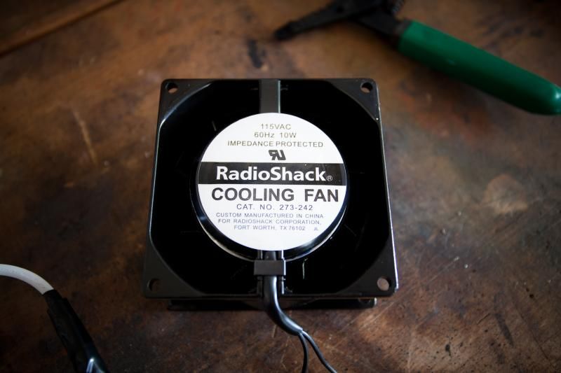 Next I bought a fan for air circulation. It was a bit difficult to find what I needed because I don't know wiring too well. People said to get a 120v computer fan, of which this was the only one i could find. Its from radio shack. I then just bought a normal power cord and cut off the end and attached it to the fan. This fan is a little loud which I did read in the reviews, but I'm fine with it for now.