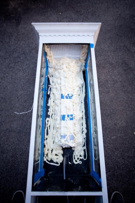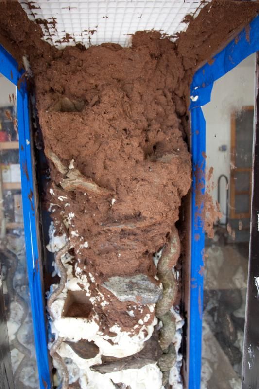 The next day I came out to see that people weren't joking when they said that Great Stuff expands more than you expect. So after carving it back some, I started the headache that was siliconing eco-earth to the foam. I completely underestimated how much silicone I would need for this. It took 6 tubes. I should also say that the enclosed area of this terrarium is 40x17x13. So thats 40 inches of foam to cover.