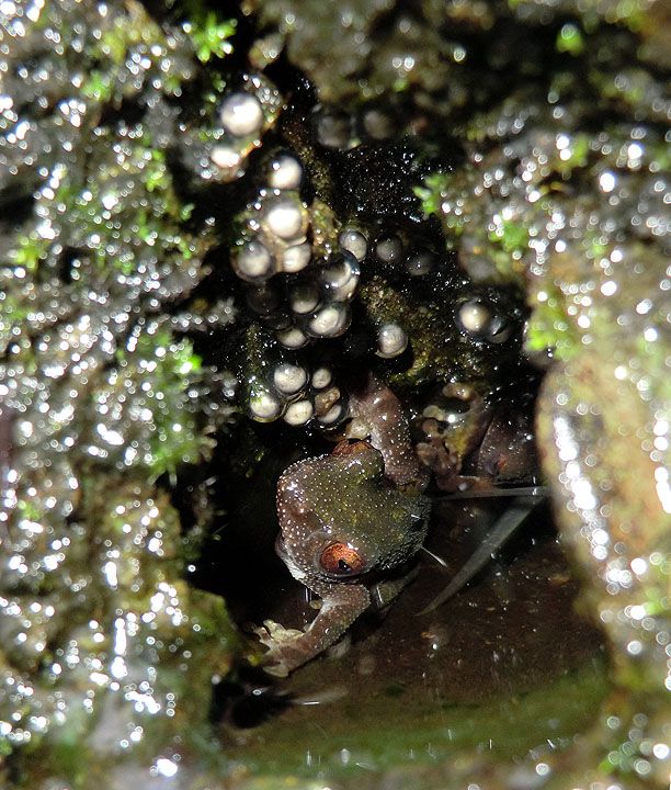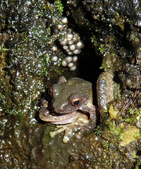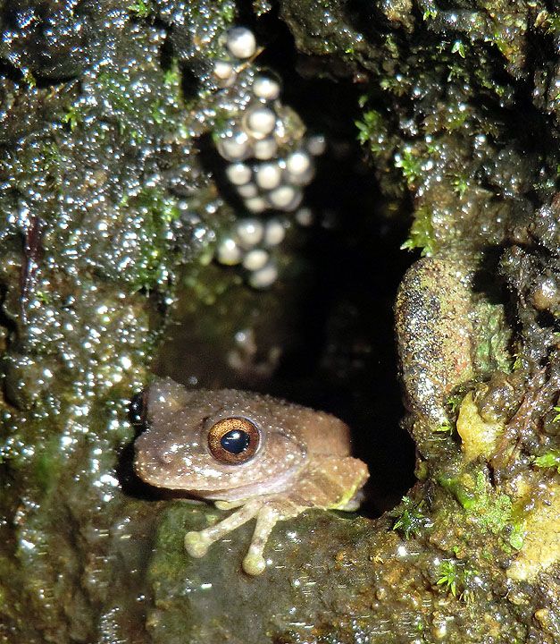 The first bunch of shots are of a frog that I'd been unsuccessful in seeing previously. Eiffinger's tree frog, Kurixalus eiffingeri, the only frog in Taiwan that I know of to display parental care. It lays eggs in bamboo or tree stumps (though these photos were taken in a crack in a wall), then the father returns periodically to moisten the eggs and keep an eye out for predators. The mother returns to feed the tadpoles unfertilized eggs from time to time. Ahhh ...!