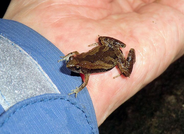 The brown tree frog, Polypedates braueri, recently separated as a distinct species from P. megacephalus (which itself was only separated from P. leucomystax in the 1980s).