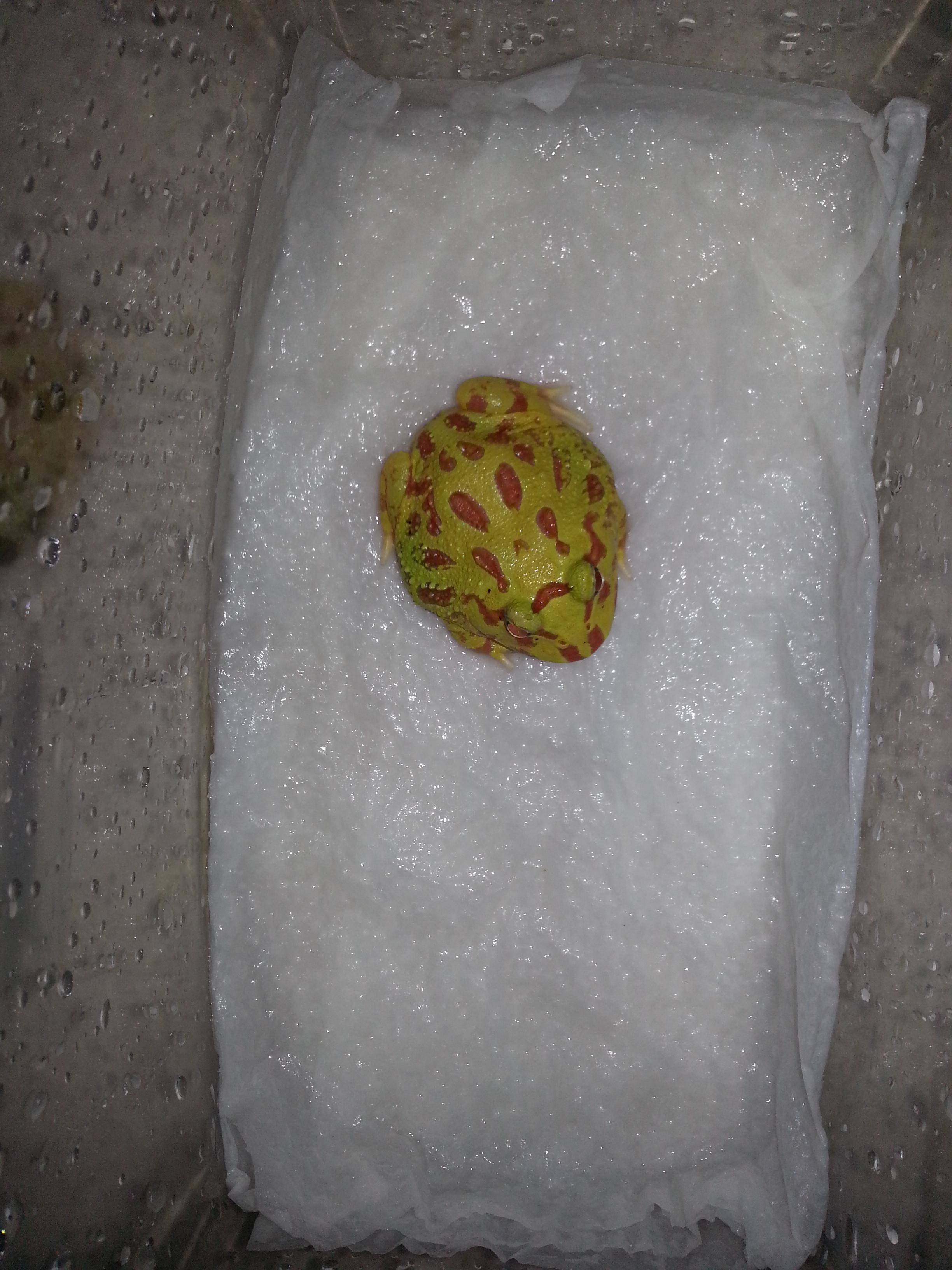 The one and only time i fed him bullfrogs was when i first got him, and it was a month ago. Stupid mistake that i made. Anyway i have house him in a hospital tank with wet paper towels. Will be getting melafix later in the day for him to soak.