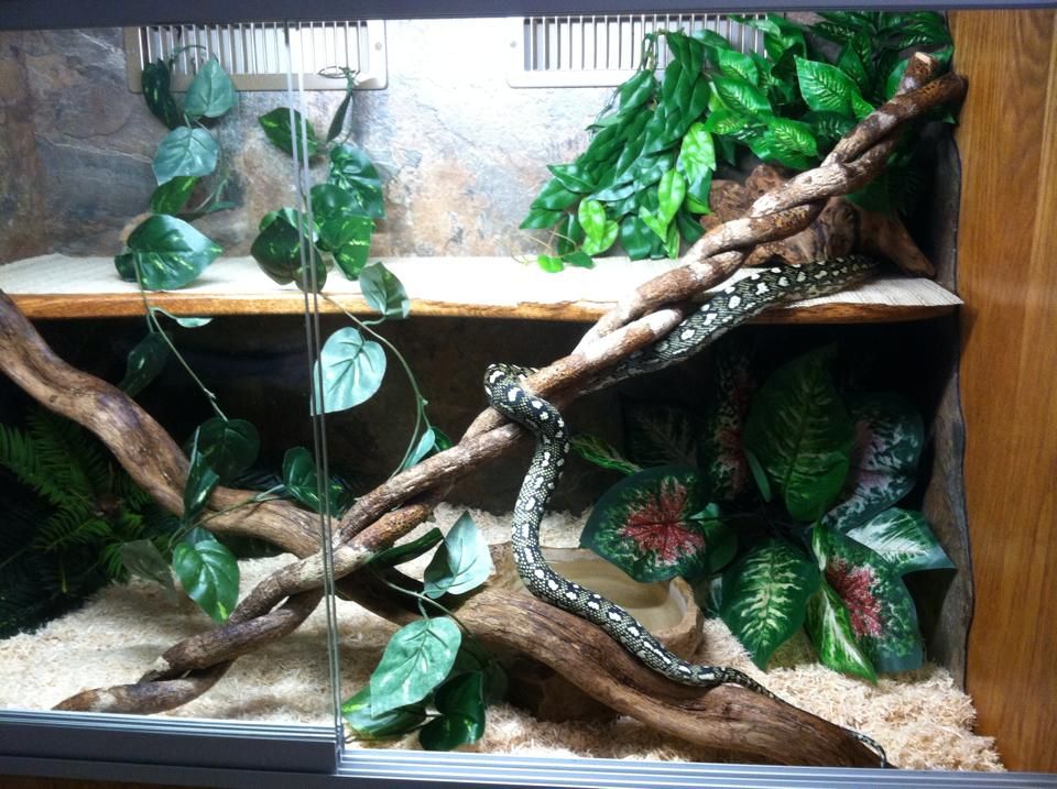 Right now the blood is in a plastic tub, but he's ready to move into his adult enclosure now. I'm actually in the process of ordering him and Luna 48" x 23" x 14" enclosures from Ed at Constrictors Northwest, and a 48" x 23" x 23" for Orion. He uses marine grade HDPE plastic that is FDA and USDA approved and totally UV and heat resistant. Be careful using PVC or other forms of plastic caging as heat and UV exposure can actually release volatiles that mess up certain hormone cascades in your pet (i.e. cause infertility)! I'll post photos once I have those setups up and ready in the future... Planning on making them semi-naturalistic and making my own backgrounds (you can only do so much with heavy-bodied snakes that trample everything, though).