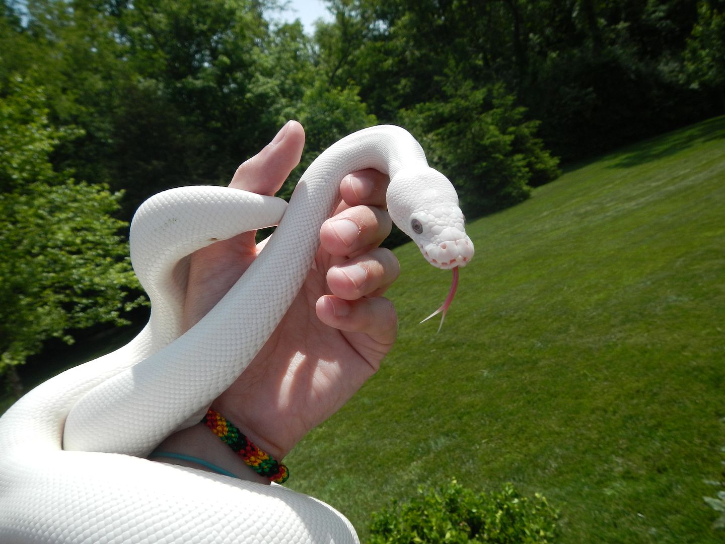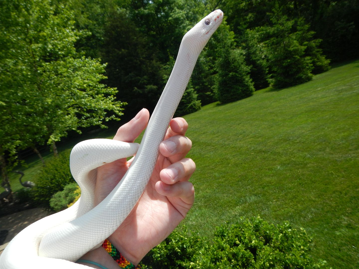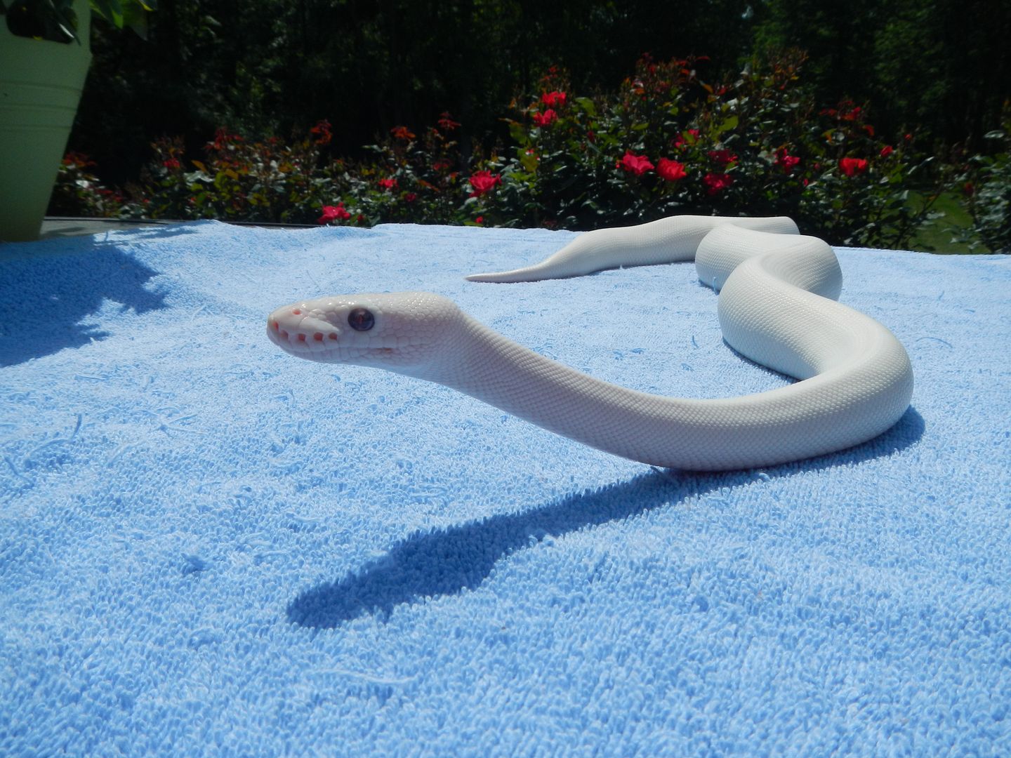 It was a gorgeous day today, so I decided to take Luna out for some fun and photos in the natural light. She's growing up fast; up to 850 grams now! Luna is a blue eyed leucistic ball python.