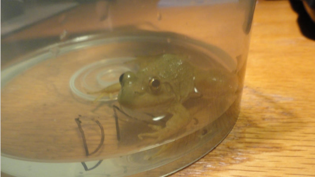 Here's a picture of the frog I took after I first brought it inside. He's only in that small DVD spindle cover because I hadn't set up the tank again yet. He was in there for 5 minutes tops, then I moved him into the tank as soon as I put the water and rocks in. Can anybody tell what species it is? Looks like a typical garden frog to me, but I'm sure it has a proper species name.
