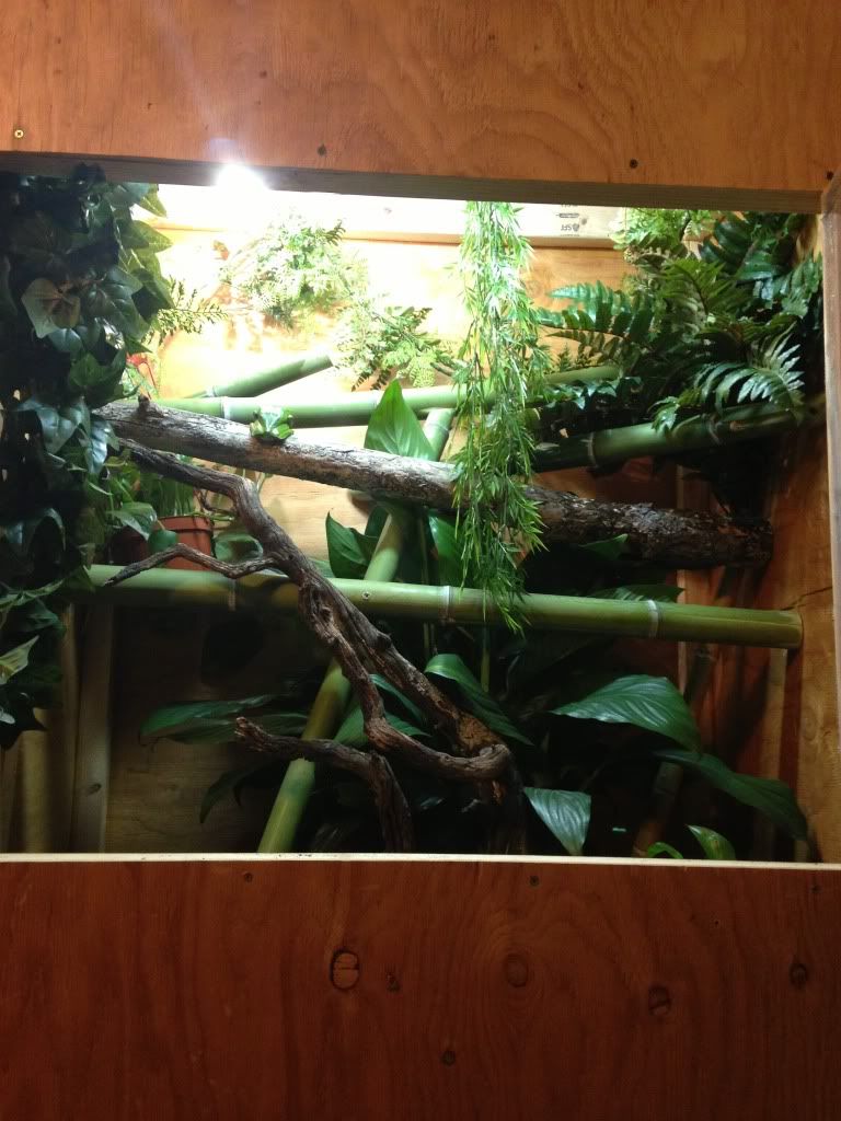 Dj. Quik - that is awesome enclosure! i would add some more plants in the upper part and perhaps smaller diameter perch somewhere high up by these bigger ones. i found they love to sit on a branches by the plant, this way they are still basking as well as hiding.
