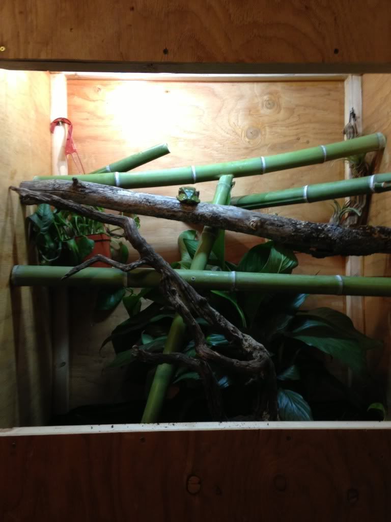 yes, these are my current owned frogs Ph sauvagii, unfortunately can't get my hands on moresorry i don't have pics of the whole enclosure, but it is basically a few plastic and silk plants handing from a walls, bunch of exo terra branches inside, felt carpet on a bottom, water bowl all that in 24x18x24 exo terra tank with background, 3 lamps on top, 5.0 UVB, basking spot 75W in a dome lamp with a dimmer, 75W night heat lamp in a dimmer as well.