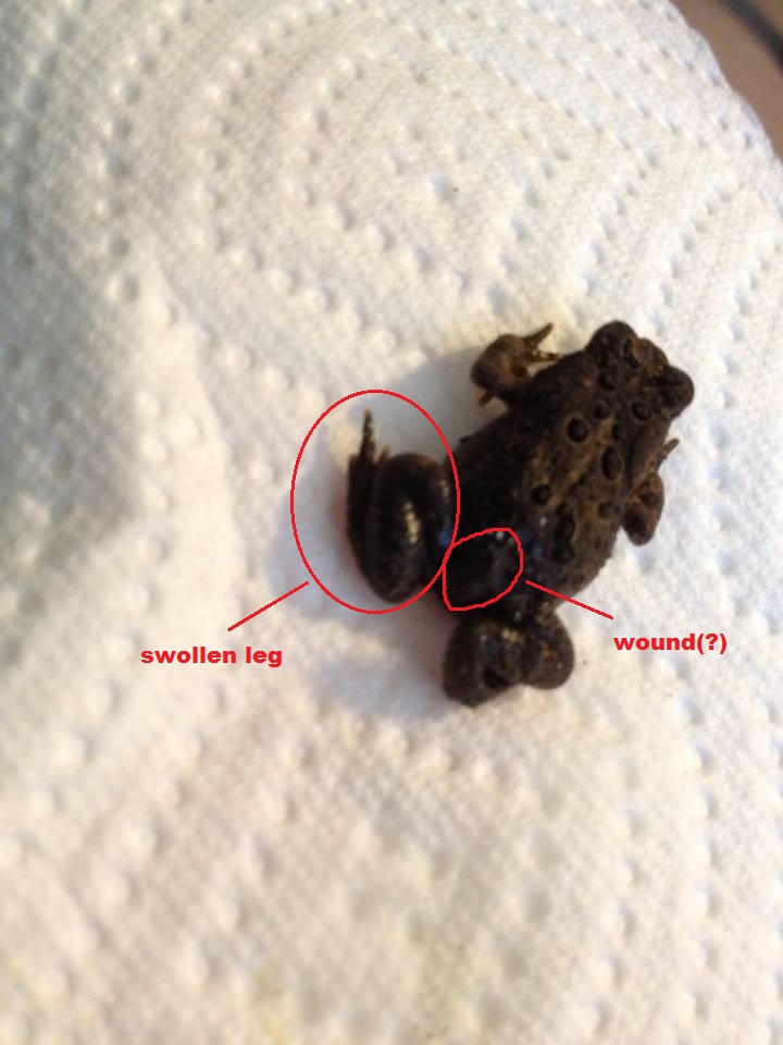 Hello, I recently caught a baby Fowler's toad near some woods. It didn't really hop away when I caught it, and now I think I know why. It appears to have a gash on its bum and one of its legs appear swollen. I had in it a natural setup and dirt was sticking to the possible gash. I have a photo but it is not that clear as I didn't want to disturb it too much. I washed off the dirt and applied diluted betadine to the wound and put him in a small cage lined with paper towels with 3 sides covered with paper. I gave him some pinhead crickets and he does eat them. It is very tiny, between the size of a dime and nickel. Its swollen leg does not have as much mobility as the other leg.