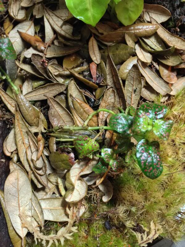 The tank is looking good. The plants seem to be adapting well to it. some of the moss has started to green up again, all in all I am very pleased with how this tank is progressing. The cork bark in the corner has a bit of white mold on the back of it. I am deputing on pulling some of the springs from my RETF terrarium and putting in this tank, the Spring Colony in there is massive now. The water has cleared up a lot and the Shrimp seem to be thriving. Hard to tell if any of them have died because they spend most of their time under the main rock in the darkness.
