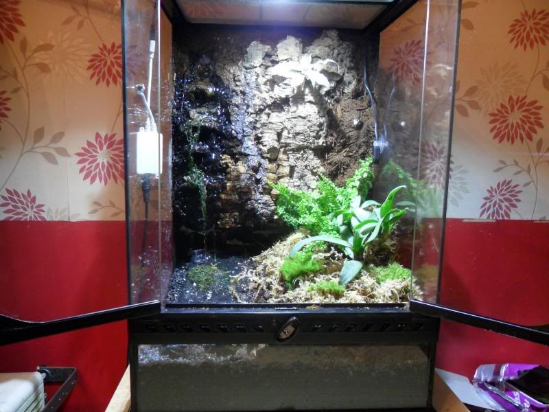 I have planted half of the Viv so far (I am currently constructing a water bath to capture water from the waterfall and create a bath and stream of which will keep the water from being in direct contact with the substrate)
