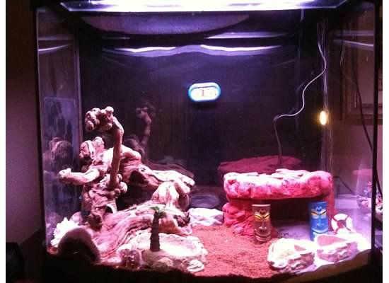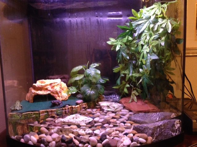 Well, I thought it would be interesting to see how my tank has transformed through the past couple of years. I originally bought this tank as a fish tank. Well after constant problems with the fish tank, fighting with it over a year, (tank crashed 3 times with decease or fin rot and/or ick, despite everything I tried) I decided to give the fish up and I made a hermit crab tank. That set up turned out cute, but I NEVER saw the hermit crabs hardly ever. So that got pretty boring just looking into a seemingly empty tank. Kept the hermit crabs for about 9 months or so and after doing a lot of research, I decided to get fire belly toads. I decided to go with these because I wanted something hardy, that can tolerate colder temperatures. The tank is kept in my room, and at night I run my AC unit it my room, so it gets pretty cold. Expecially in winter. The temperature stays stable inside the tank though, but wanted to get something that can tolerate colder temperatures as well and fire belly toads fit. I have almost had them for a year now and I LOVE them. They are soo fun to watch, they each have there own personality, I have just really enjoyed them and wish I would have gotten them sooner!