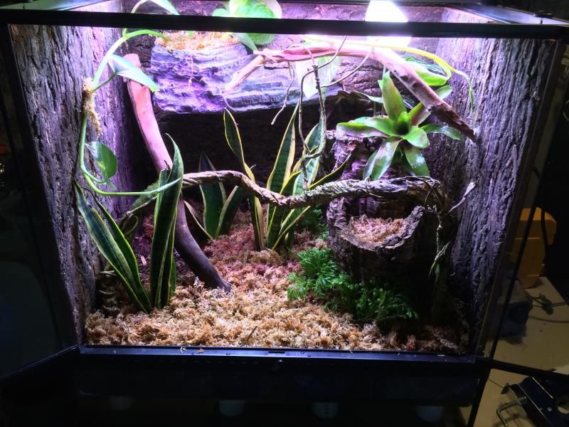 This is it nearly fully complete. We still have one more snake plant to transplant into the tank and leaf litter to add. The pothos is in place and the wood pieces have been secured into place.