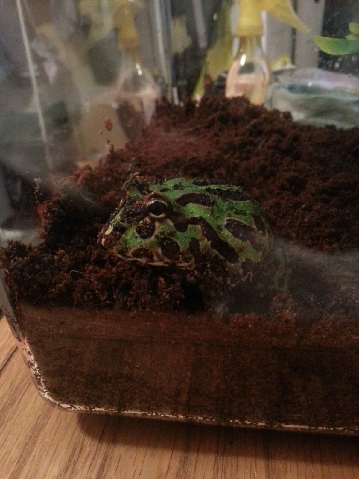 Hey guys, I just recently bought a pacman frog from the petstore. I almost felt obligated, they had him in a around 4 x 3 container and I saw him the last time I went several months ago. No room to burrow or anything. I'm not sure how old he is, he's a little over 2". Anyways my question is, is it okay to gut feed the crickets apples/carrots? I wasn't sure if those veggies and fruits are okay for the pacman. I've never had to store crickets before so I just have them in a plastic tupperware with holes poked in it right now. I wish mr. pac would come out and see me, he only seems interested in burrowing for 10's of hours. Thanks guys! Also, if anyone could take a guess at the species/sex that would be nice too.