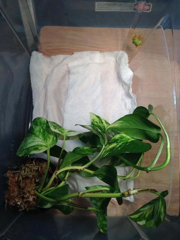 I always go super simple for the QT tank. I bought a cheap Rubbermaid container and punched holes in the lid. Put a couple paper towels (the kind with no prints on them) in the bottom and soaked them in treated tap water. A small 3" pot with some pothos clippings in them with a heat source. The great thing about going simple (paper towels substrate) is that you can easily tell if the frog is pooping regularly. You do need to change the paper towels daily to ensure the frog is in a clean environment, but totally worth it.