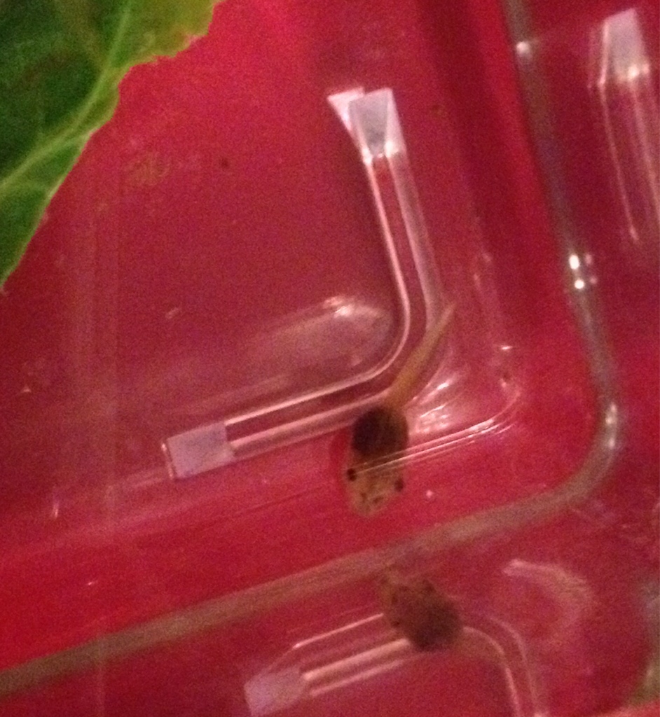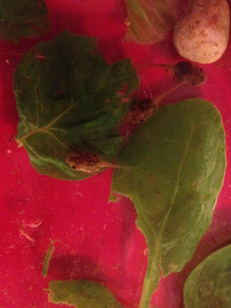 Lumpy made it through the night, I put him in a small container so he doesn't have to use too much energy to move around if he needs to, and I can keep a better eye on him. It looks like he was nipped on the tail by something, there's still some red flecks around his tail.