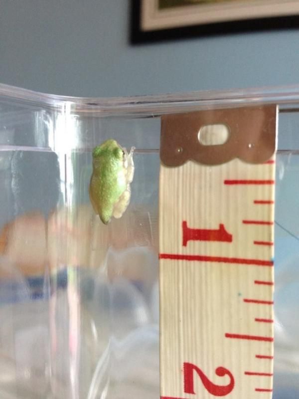i have raised a couple tadpoles and now i have a 2-legged tadpole and a froglet. I am wondering what you use for a terrarium or vivarium. Do you need to keep it warm? (these treefrogs live thru the harsh winters, so i am not sure.) Tell me about your enclosures and post photos if you have any. I have flightless fruit flies on their way. Tadpole with 4 legs turned into froglet overnight, last night. His tail almost totally resorbed that fast. He also turned green. He is so tiny. Was planning to release, but now seeing their size, I wonder if they will be eaten by large insects. The tadpoles were in the pool cover of my neighbor who did not want to kill them. I took a group of 9. After a water change, I lost 7. These 2 lived. Now i have a cute teeny little guy named Sticky, and waiting on #2 to morph.