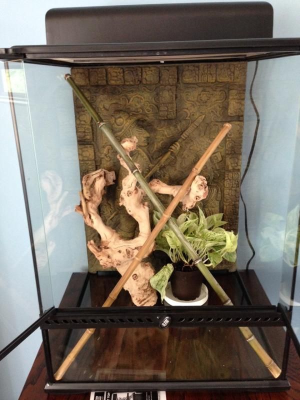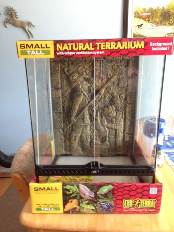 i got an Exo Terra on sale at Petco. this is the 18 x 18 x 24h. it was $99. my hubby made me a custom table for it. He built it slightly taller than most tables so it's at a good height to view. it will go over a standing AC unit in the living room, but won't be affected by the ac. the room will be kept at a decent temp. Hamburg Pa tomorrow for some decorations and water bowl. ( and who knows)