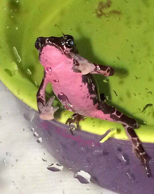 These little cuties are called Atelopus bartolini. They are Suriname toads from South America. The males reside amongst the natural rocks of the waterfalls and streams, while the lady toads live along the forest floor "gardens". During the mating season, the females come to the waters edge and the males come singing/calling to attract them.