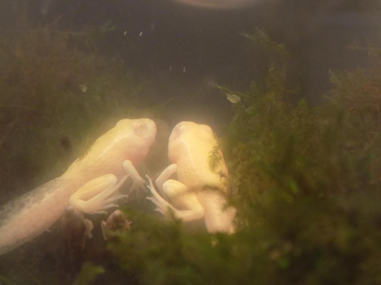This past fall my dad came across some albino tadpoles (most likely green frogs) in a puddle down in the farm fields around here. Up until this point we've been keeping them in a tank with an aerator, feeding them algae pellets, and changing the water regularly, and they've been doing fine.