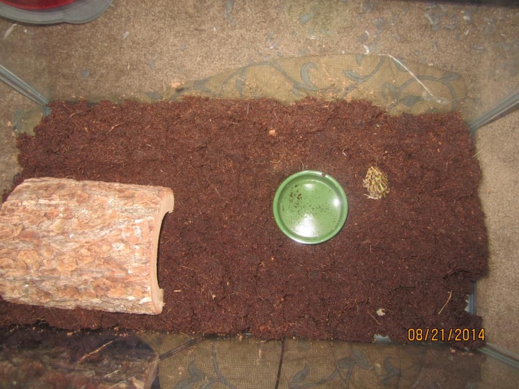 I would definitely add some artificial plants for hides. A tiny baby like that would feel really vulnerable in so much open space. You can easily buy kritter keepers online http://www.amazon.com/Lees-Kritter-K...kritter+keeper